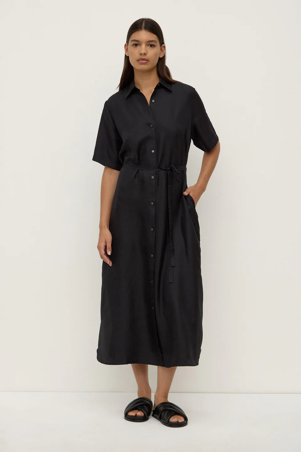 The Amelie Shirt Dress in black is a maxi shirt dress made from 100% silk, featuring a button-down front, waist tie, and side splits.