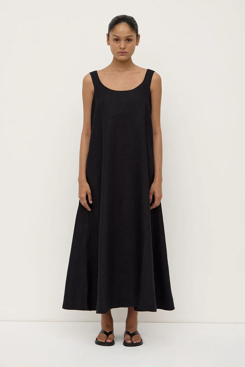 A-line maxi dress, crafted from 100% linen, featuring a scoop neckline and side pockets.
