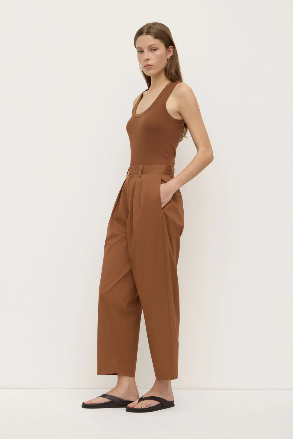 Crafted from 100% cotton, this pleat-front pant offers a cropped 3/4 length fit through the leg and a relaxed yet tailored silhouette. Features side pockets, back pockets and an internal drawcord for adjustability.