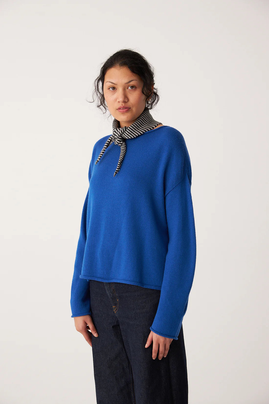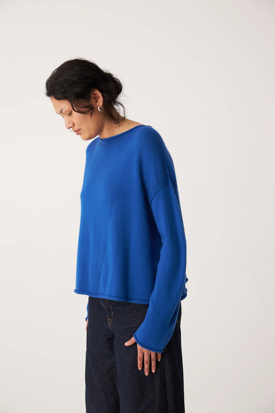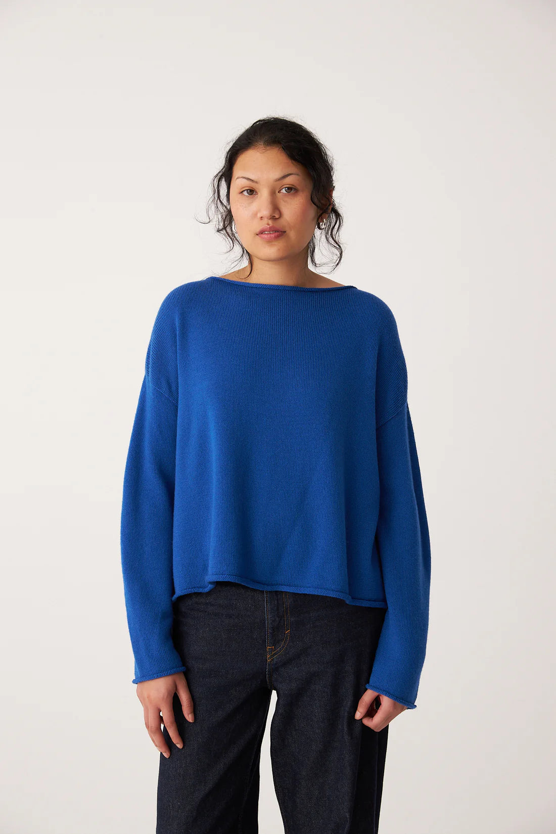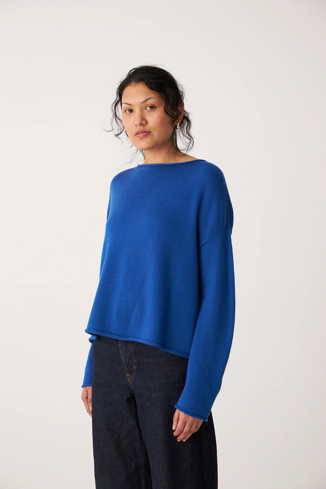 The signature Doll's jumper, knitted in a soft mid-weight merino and designed to be thrown on in any season. Features a boat neck, a boxy fit, and rolled edges.