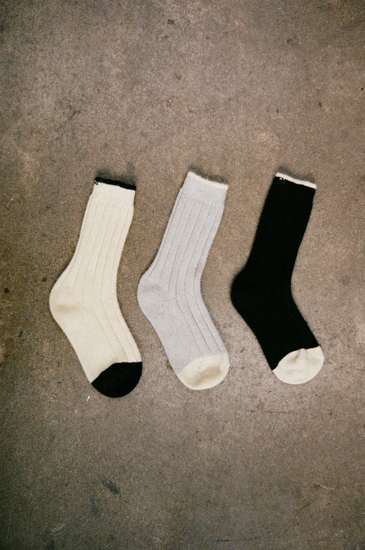 Cosy and soft ribbed socks crafted from a locally spun chunky yarn for socks that feel like they have been hand knitted. With wear this cosy yarn softens to create a relaxed slouchy look.