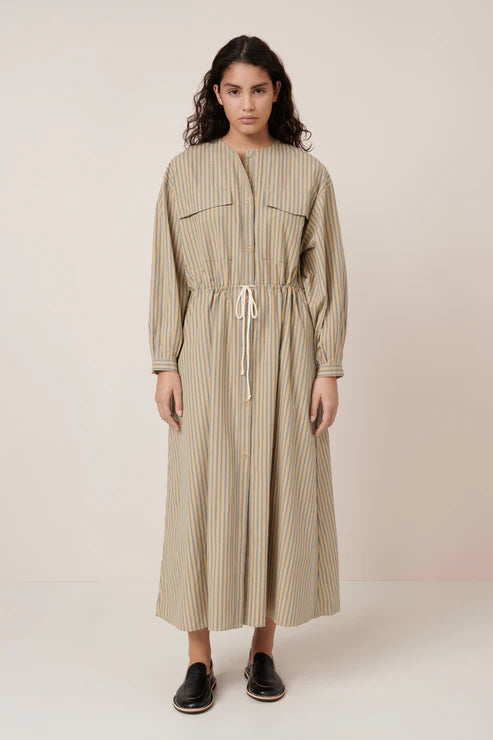 Defined by its utilitarian detailing, the Array Dress features oversized front pockets, a back pleat, and a slightly dropped waist. Designed for an oversized fit, it has a functional waist drawcord for versatile styling. Finished with side seam pockets and fastened with nut buttons through the front, this dress is craft from our double pinstripe organic cotton poplin shirting.