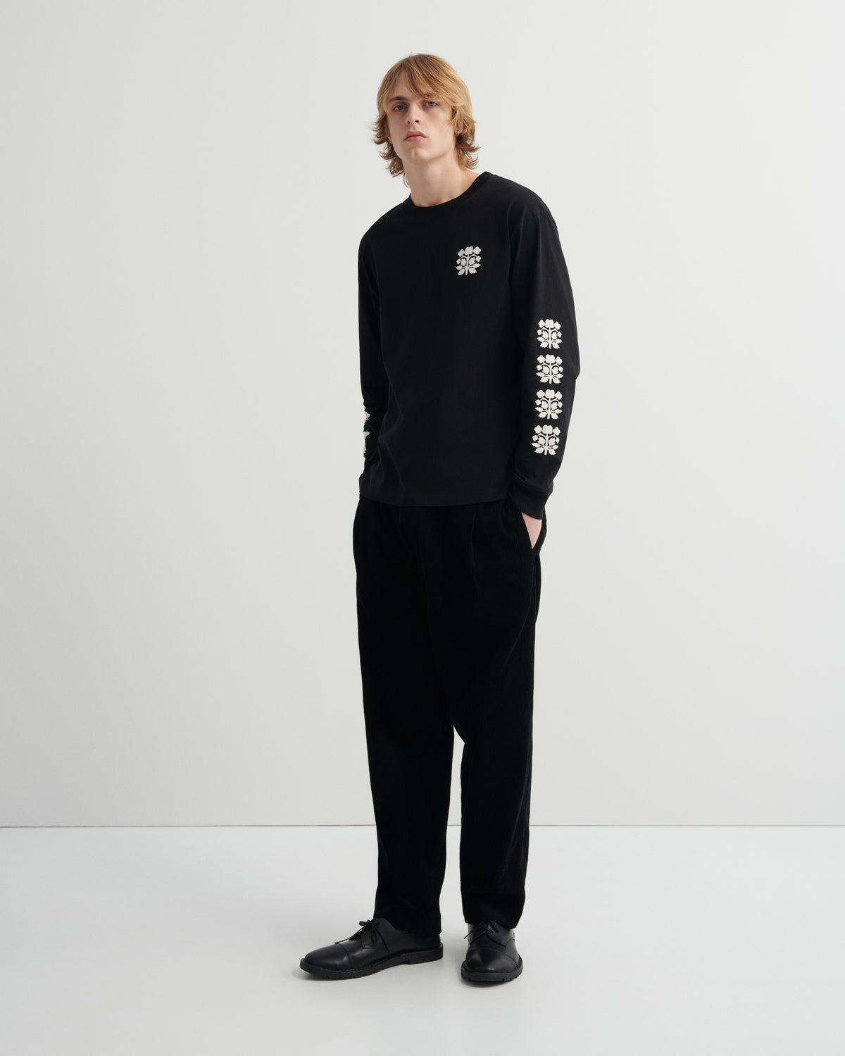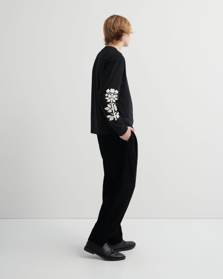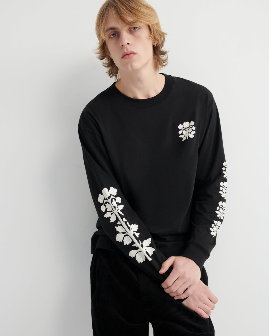 Inspired by skater tees, with a dropped shoulder and easy, relaxed fit. A stencil screen print at the chest and forearm adds a subtle graphic edge, while ribbed neck and cuffs provide a clean, structured finish.
