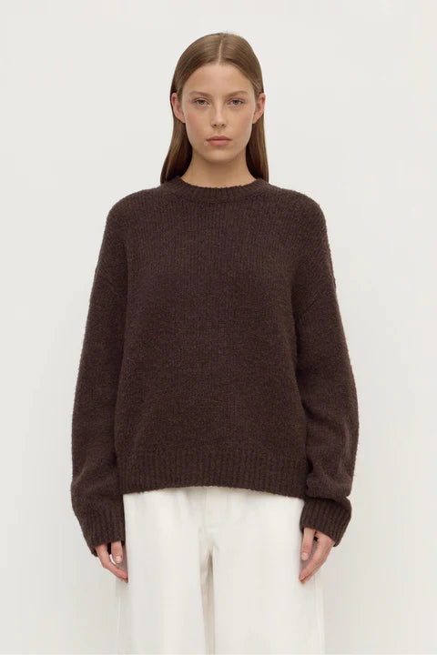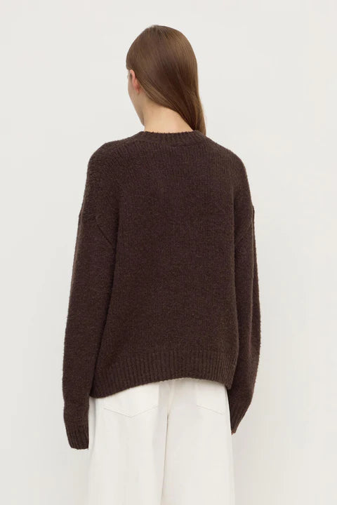 The Ariel Knit in dark choc is an alpaca/wool blend knit with a crew neck and slightly cropped length.