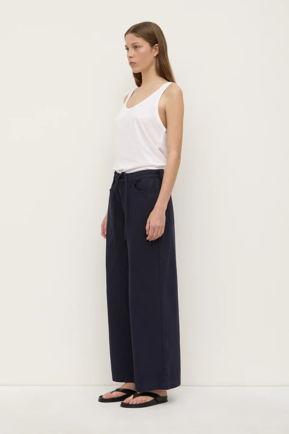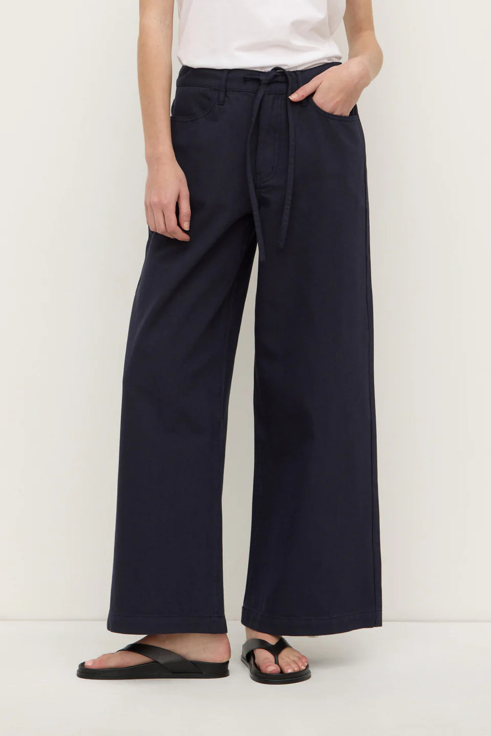 - Fly front- Wide leg silhouette- Adjustable skinny waist tie- Cotton twill fabrication- Back and front pockets