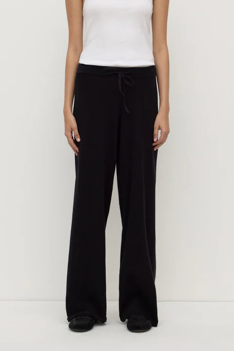 The Cotton Cashmere Lounge Pant in black is a relaxed leg pant with a covered elasticated waistband and waist tie, crafted from a soft cotton cashmere blend.